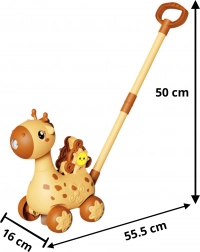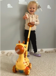Długa prowadnica umożliwia wygodne prowadzenie i wspiera motorykę dużą oraz koordynację. 4 koła zapewniają stabilność i płynną jazdę na różnych nawierzchniach. W zestawie znajdują się także elementy do przypinania dla kreatywnej zabawy. Idealna na podwórko, do parku i pokoju dziecięcego.