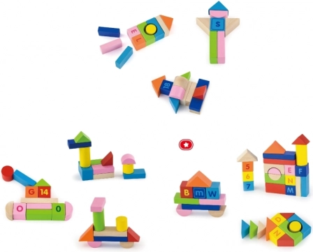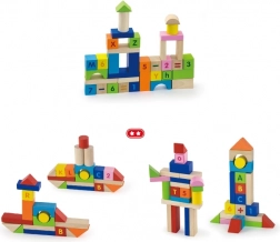 Kolorowe klocki z wytrzymałego drewna z nadrukiem liter, cyfr i znaków matematycznych wspierają naukę poprzez zabawę i wytrzymują codzienne użytkowanie.