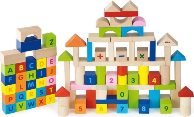 100 solidnych drewnianych klocków z alfabetem i cyframi