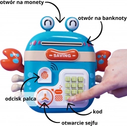 Urocza elektroniczna skarbonka w kształcie kraba marki WOOPIE pomaga dzieciom od 3 lat uczyć się oszczędzania. Oferuje bezpieczne przechowywanie monet i banknotów, kod PIN, symulowany czytnik odcisku palca oraz interaktywne dźwięki. Multifunkcyjne wykonanie (skarbonka, sejf i plecak) z wytrzymałego plastiku jest bezpieczne dla dzieci i w atrakcyjny sposób rozwija umiejętności finansowe.