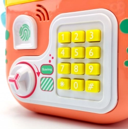 Wpłacaj monety i banknoty przez osobne otwory, ustaw hasło i otwieraj za pomocą pokrętła. Idealne na pierwsze kroki w edukacji finansowej.