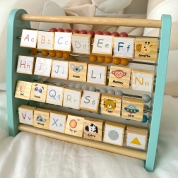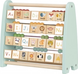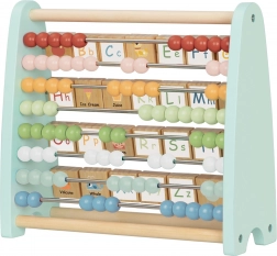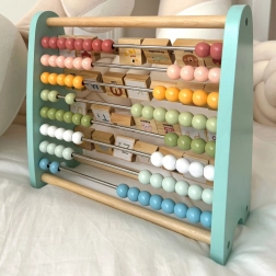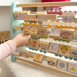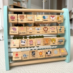 Jedna strona zawiera klasyczne liczydło z koralikami do liczenia, druga strona ma obrotowe bloki z literami alfabetu i obrazkami do interaktywnej nauki.