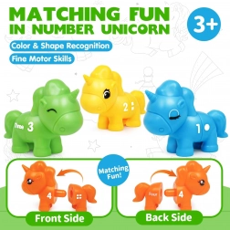 Edukacyjna zabawka „Dopasuj Cyferki” przeniesie Twoje dziecko do magicznego świata jednorożców, gdzie może łączyć części według kolorów, cyfr lub kształtów. Ta zabawna i rozwijająca gra stymuluje zdolności manualne, umiejętności obserwacyjne oraz logiczne myślenie dziecka.