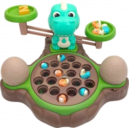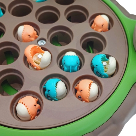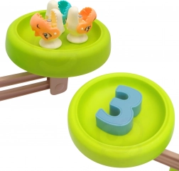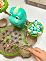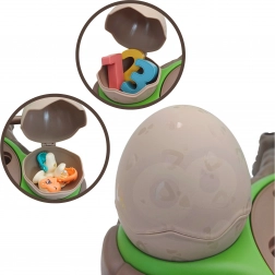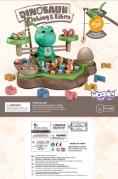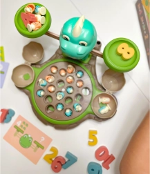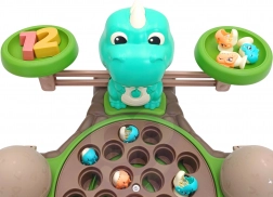 Zabawka Dinozaur z wagą od WOOPIE daje dzieciom możliwość odkrywania świata liczb i działań matematycznych podczas wciągającej zabawy w łowienie dinozaurów. Na podstawie znajduje się obrotowy talerz, z którego można łowić małe dinozaury. Po przełączeniu przycisku talerz zaczyna się obracać, a melodia towarzyszy dzieciom podczas zabawy. Za talerzem umieszczony jest duży dinozaur, który pełni funkcję wagi, oraz miejsce na wędki do łowienia, które można ozdobić liśćmi z zestawu. Po bokach znajdują się dwa zamykane jaja na schowanie złapanych dinozaurów.