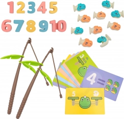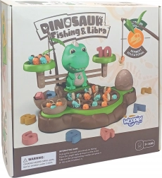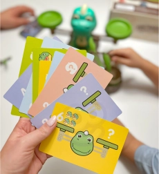 Zawiera 10 odważników, 21 dinozaurów, 2 wędki i 10 kart — wszystko, czego potrzeba do zabawy i nauki.