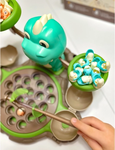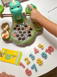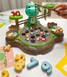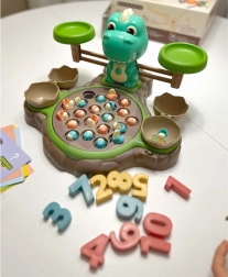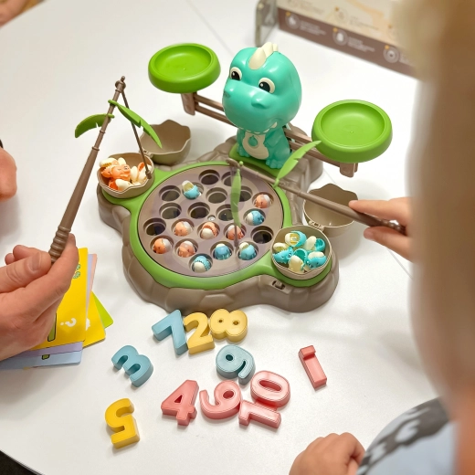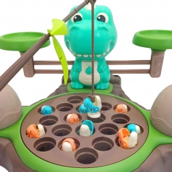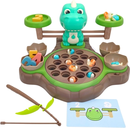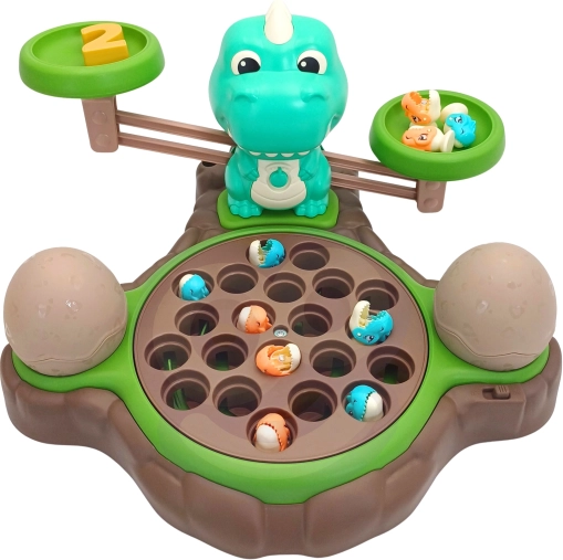 Zabawka zawiera obracający się talerz, wagę oraz łowienie dinozaurów, co zapewnia godziny rozrywki i nauki.