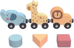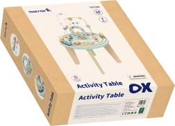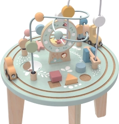 Ten wysokiej jakości drewniany stolik wprowadza dzieci w barwny świat kształtów i kolorów. Dwutorowy labirynt motoryczny trenuje zręczność palców, sorter kształtów uczy rozpoznawania form i barw, koła zębate rozwijają logikę i zrozumienie zależności przyczynowo‑skutkowych, a pociąg z uroczymi zwierzątkami objeżdża trasę wokół stolika.