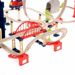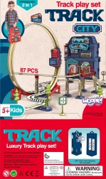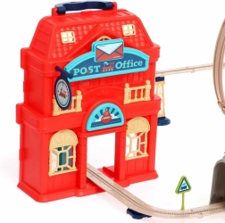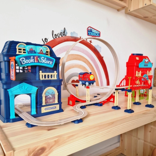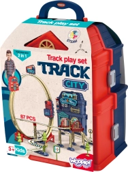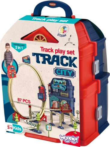 Kolejka WOOPIE Track City przynosi dzieciom bogaty świat wyobraźni na powierzchni 3,5 metra torów. Dzięki zawrotce, wiaduktowi i przejazdowi kolejowemu dzieci łatwo tworzą dynamiczne trasy i miejskie scenki. Walizka 2w1 działa jako praktyczne opakowanie i element świata zabawy – po rozłożeniu powstają dwa stylowe budynki (np. poczta i księgarnia), które wzbogacają historyjki i zabawę.