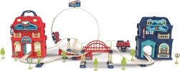 Praktyczna walizka pełni funkcję pudełka do przechowywania i elementu toru – po rozłożeniu tworzy dwa tematyczne budynki, które wzbogacą każdą scenkę.