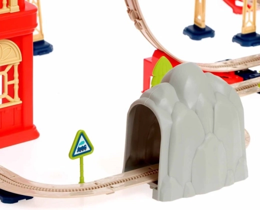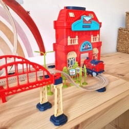 Lokomotywa z efektami dźwiękowymi nadaje zabawie klimat prawdziwej kolei. Wymaga baterii AAA (brak w zestawie).
