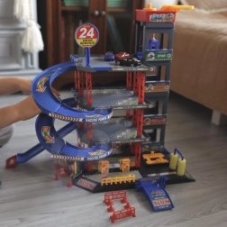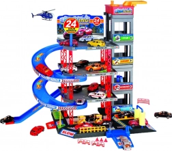 W pudełku znajdziesz wszystko do natychmiastowej zabawy: 4 metalowe autka, helikopter, znaki drogowe, pachołki, elementy najazdowe, windę oraz naklejki do tworzenia realistycznego otoczenia. Wytrzymała plastikowa konstrukcja jest lekka, stabilna i odpowiednia do codziennej zabawy.