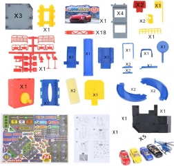 W opakowaniu znajdują się 4 metalowe autka, helikopter, znaki drogowe, pachołki oraz naklejki. Wystarczy złożyć i zabawa może zacząć się od razu.