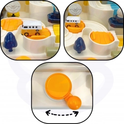 Dźwignie, przyciski i pokrętła wprawiają w ruch całą trasę. Dziecko trenuje małą motorykę, koordynację i koncentrację wyłącznie manualnie.
