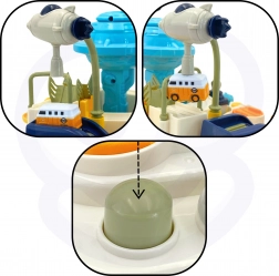 Tematyczne otoczenie z rampami, obrotnicą i wyrzutnią pojazdów zapewnia dynamiczne starty i kosmiczne misje.
