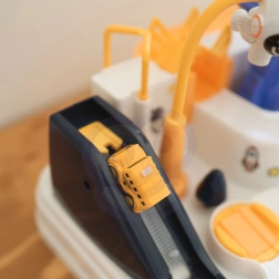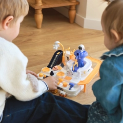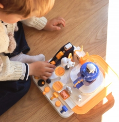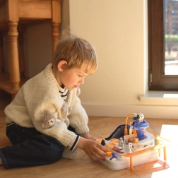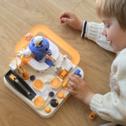 Stacja kosmiczna zmienia się w dynamiczne boisko do zabawy: dzieci planują trasę, pokonują przeszkody i za pomocą przycisków oraz manipulatorów kierują autkami po rampach, windach i obrotowych platformach. Magnetyczna rakieta przenosi pojazdy „powietrzem” na podnoszony most, który można w razie potrzeby opuszczać i podnosić.