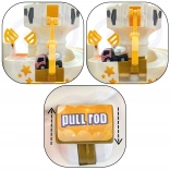 Przyciąga samochodzik i przenosi go na most podnoszący.