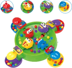 - 1 baza do gry z mechanizmem, 4 kolorowe postacie (żółta, czerwona, niebieska, fioletowa), kolorowe kuleczki, oryginalne opakowanie z instrukcją