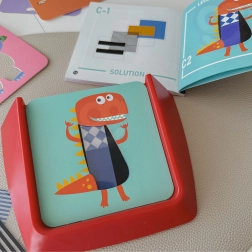 Podstawka ułatwia układanie, a czytelne karty ze wzorami prowadzą dzieci krok po kroku do rozwiązania.