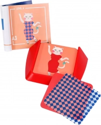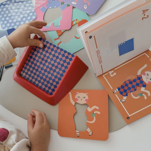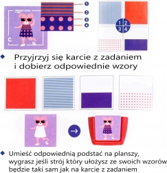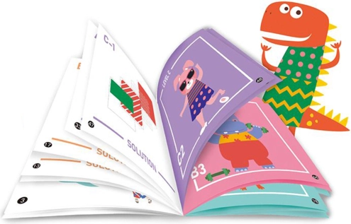 W zestawie znajduje się stabilna podstawka, cztery szablony postaci oraz bogaty wybór kart ze wzorami, a także książeczka z zadaniami i rozwiązaniami. Gra doskonale rozwija percepcję przestrzenną, motorykę małą oraz wzrokową percepcję kształtów, kolorów i wzorów. Świetna jako edukacyjny prezent dla przedszkolaków.