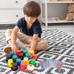 Szybkie układanie czapek według wzoru rozwija małą motorykę u dzieci.