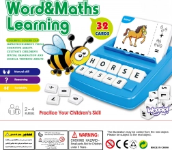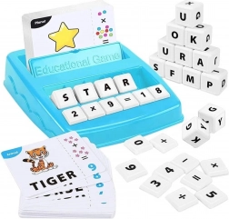 Gra zawiera niebieską plastikową tackę oraz białe klocki do nauki poprzez układanie słów i równań matematycznych.