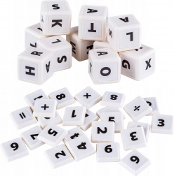 - 32 karty, 1 tacka, 10 kostek z literami, 20 kostek z cyframi, 5 kostek symboli