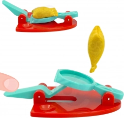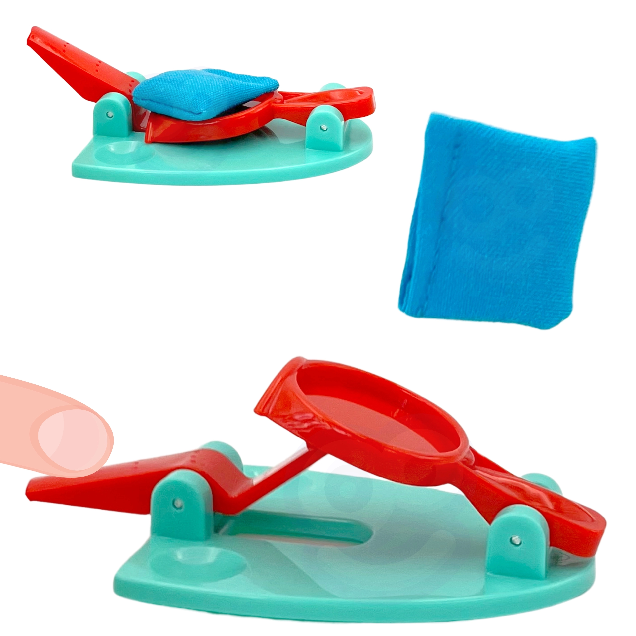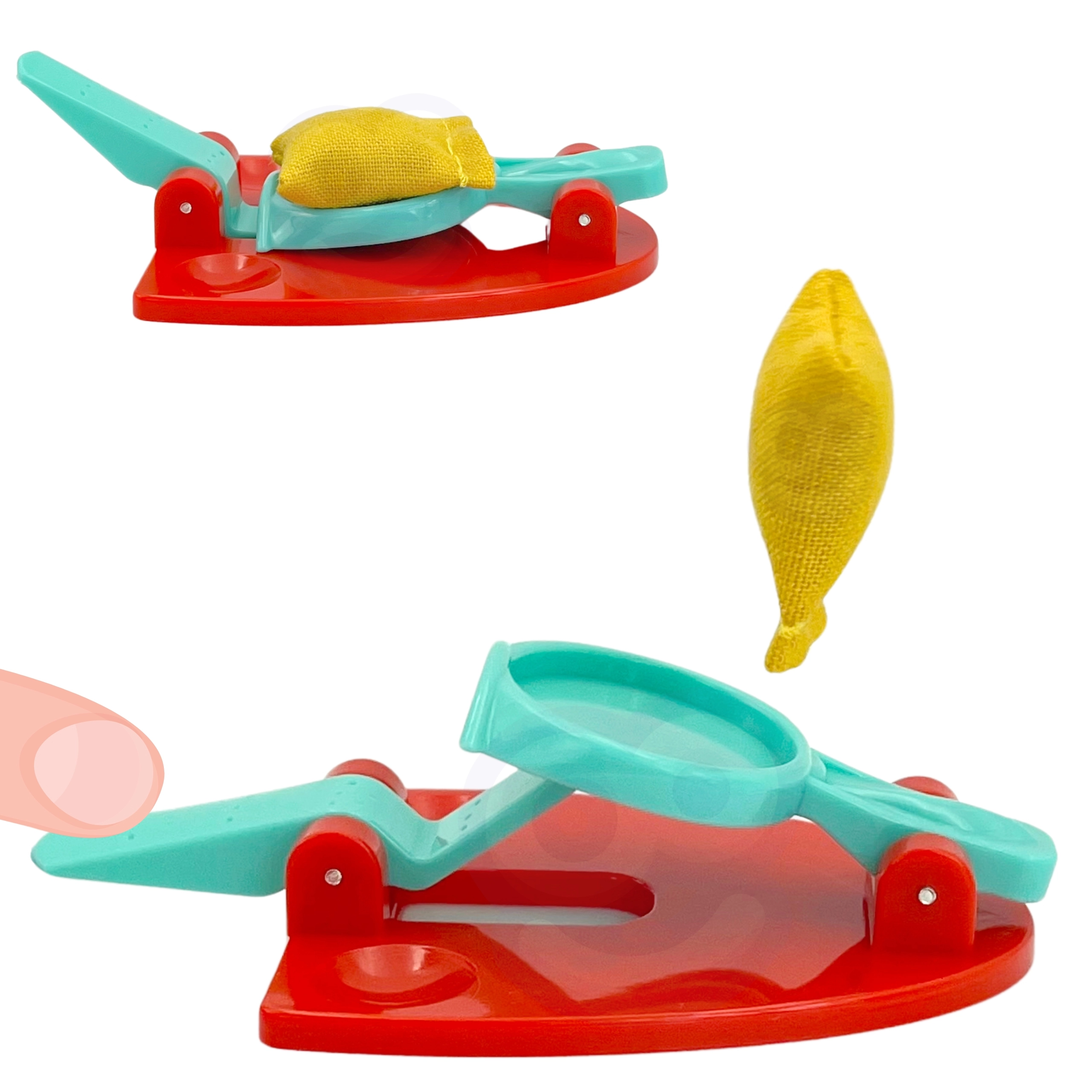Zabawna rodzinna gra Woopie Głodny dinozaur oferuje dynamiczne pojedynki dla dwóch graczy. Za pomocą katapult wystrzeliwujesz miękkie woreczki do paszczy dinozaura – szybkie zasady, prosta mechanika i mnóstwo zabawy. Gra świetnie rozwija koordynację oko–ręka, spostrzegawczość i celność. Wygrywa ten, kto jako pierwszy pozbędzie się wszystkich swoich woreczków.