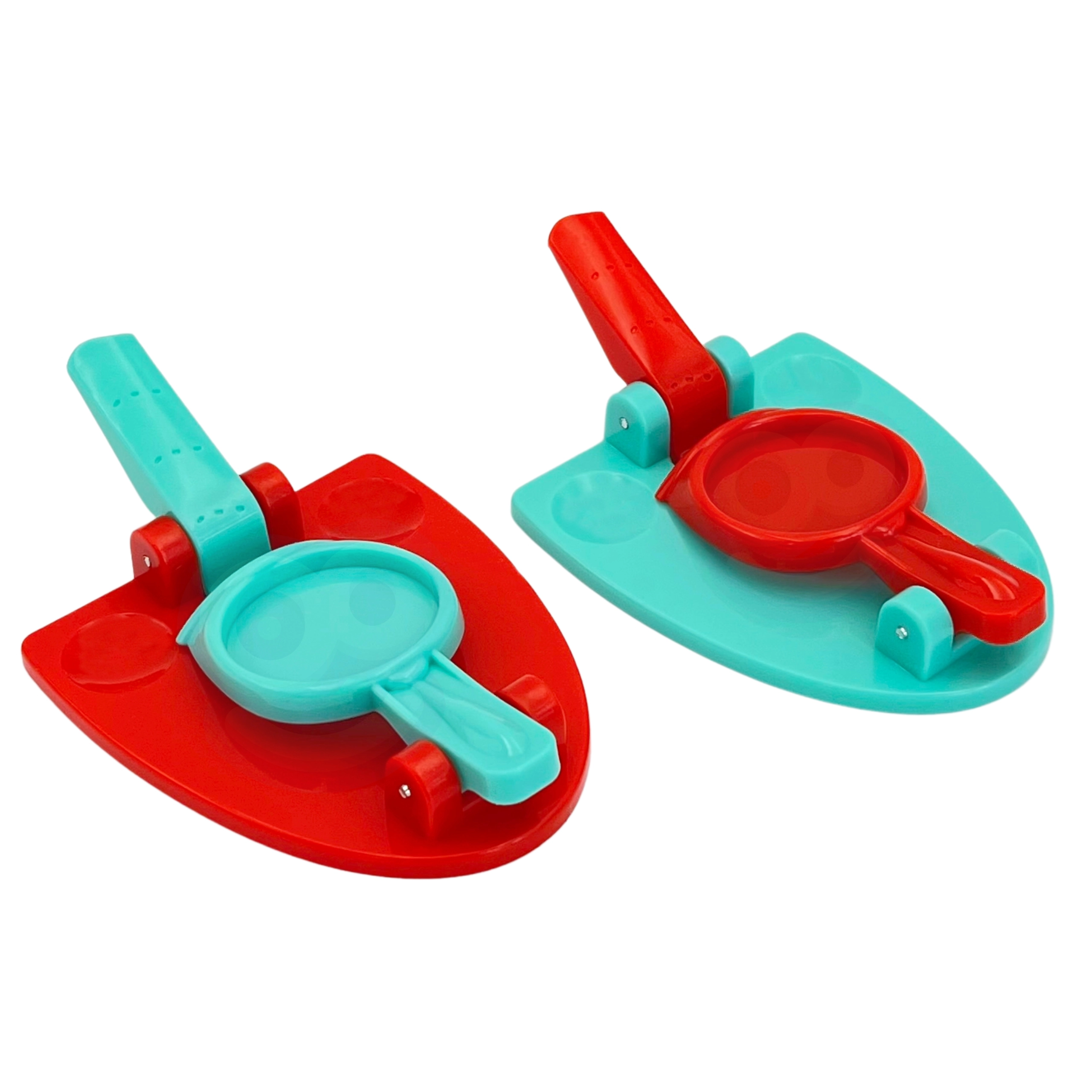 Dwa wytrzymałe wyrzutniki pozwalają łatwo kontrolować siłę i kierunek. Wystarczy nacisnąć i wystrzelić woreczek prosto do paszczy dinozaura.