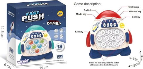 Elektroniczna gra WOOPIE Pop It Rakieta zapewnia dzieciom od 3 lat mnóstwo interaktywnej zabawy i stymulacji sensorycznej. Dzięki efektom świetlnym i dźwiękowym zachęca do dłuższej zabawy, rozwija motorykę małą, koordynację oko–ręka i pomaga redukować stres. Solidne i bezpieczne wykonanie z trwałego materiału gwarantuje długą żywotność.