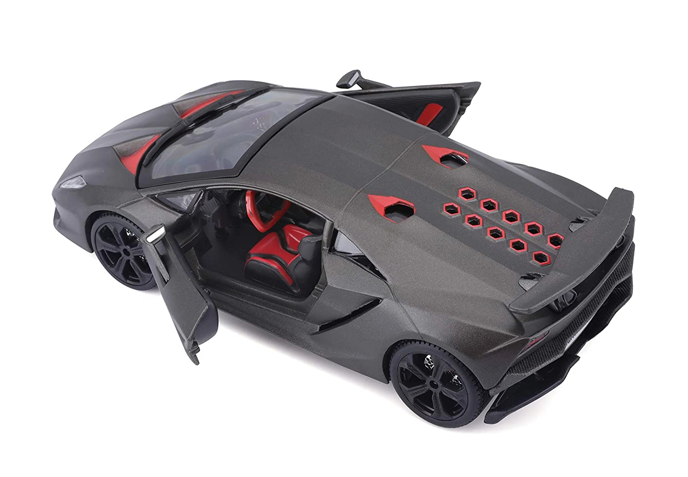 Obejrzyj czarno-czerwony kokpit z precyzyjnymi detalami foteli, deski rozdzielczej i kierownicy – idealny do ekspozycji i zabawy.