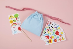 - tekstylny woreczek, drewniany aplikator, 5 arkuszy naklejek (109+ szt.)