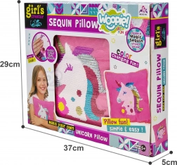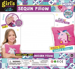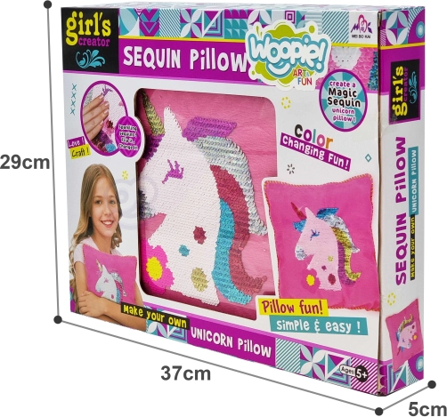Zawartość opakowania: poszewka na poduszkę, wypełnienie/poduszka, igła, nić, cekiny.