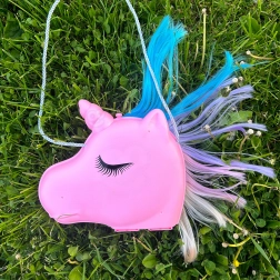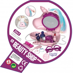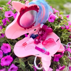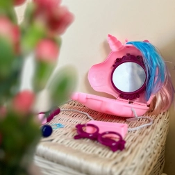 Ten magiczny zestaw łączy torebkę i toaletkę w jednym. Po otwarciu pojawia się lusterko i starannie ułożone akcesoria do zabawy w fryzjerkę i makijaż. Dzieci mogą czesać kolorową grzywę jednorożca, ozdabiać się pierścionkami czy okularami i „suszyć” włoski – wszystko bezpiecznie jako zabawa na niby.