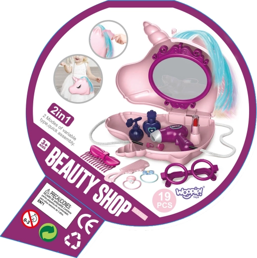 Urocza dziecięca toaletka 2w1 marki WOOPIE w formie torebki z motywem jednorożca zachwyci każdą małą elegantkę. Przenośny zestaw kryje lusterko, grzebyki, okularki, „suszarkę” i inne akcesoria, dzięki czemu dzieci mogą w każdej chwili bawić się w fantastyczny salon piękności. Dzięki długiemu paskowi i kompaktowej formie zestaw jest łatwy do przenoszenia, jednorożec ma stylizowane włoski, a bogate wyposażenie (aż 19 elementów) wspiera kreatywność i zabawę w małą księżniczkę.