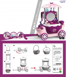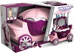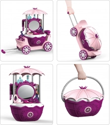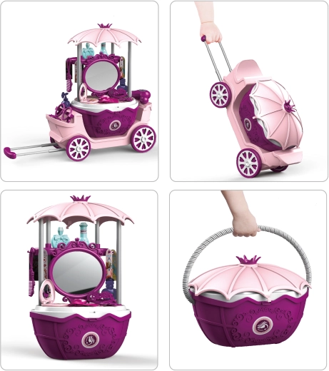 Ta różowo-fioletowa toaletka dla dzieci łatwo składa się w praktyczną walizkę z wysuwaną rączką i kółkami – idealna do domu i w podróż. Dzieci mogą otworzyć własne przenośne studio makijażu, czesać, malować i dbać o „klientów” według swojej fantazji.