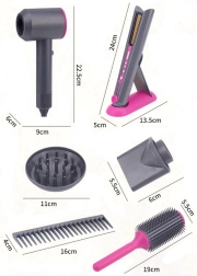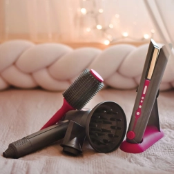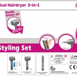 - Bogate wyposażenie – nasadki do suszarki, okrągła szczotka i grzebień do różnych fryzur.