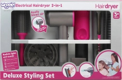 Zestaw fryzjerski WOOPIE ucieszy wszystkie małe stylistki i stylistów. Zawiera bezpieczną suszarkę z nawiewem powietrza, prostownicę z dźwiękiem i światłem oraz praktyczne akcesoria fryzjerskie. Wspiera motorykę małą, kreatywność i zabawy w odgrywanie ról, a przy tym jest w pełni bezpieczny dla dzieci – prostownica nie nagrzewa się.
