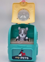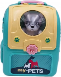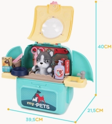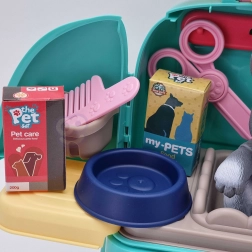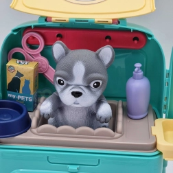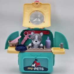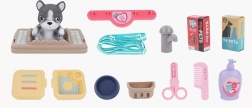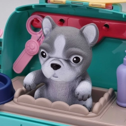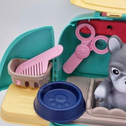Zawiera figurkę pieska, grzebień, nożyczki, koszyk na akcesoria i więcej.