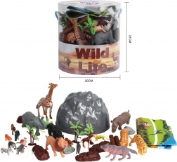 Figurki zwierząt, akcesoria (drzewka, kamienie), tematyczna mapa safari, wiadro do przechowywania