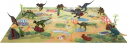 Kolorowa mata z trasami i atrakcjami tworzy dla dzieci natychmiast gotowe środowisko do opowieści z epoki dinozaurów i poszerza możliwości zabawy.