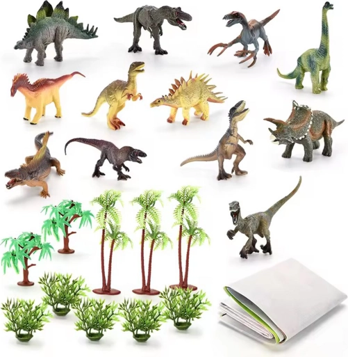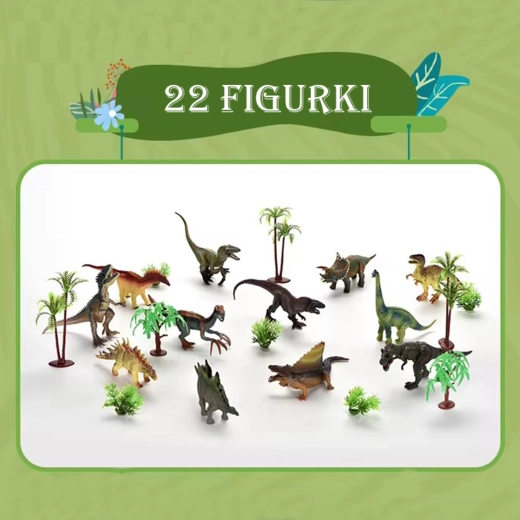 - 12 figurek dinozaurów, 10 figurek roślin/drzew, miękka mata, walizeczka