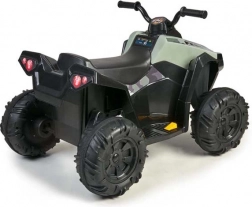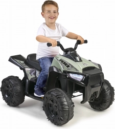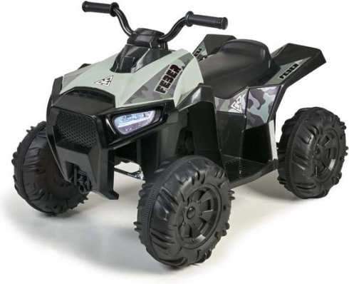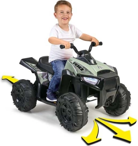 Piękny dziecięcy elektryczny quad hiszpańskiej marki Feber. Kolor kamuflażu nadaje terenowy wygląd. Quad jest wyposażony w duże, wytrzymałe koła dla lepszej przyczepności, a jego praca jest cicha i nie uszkadza podłóg.