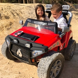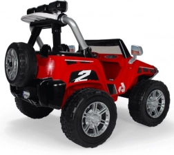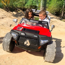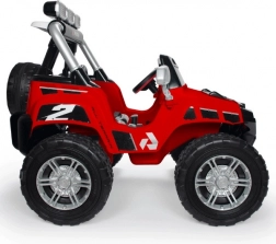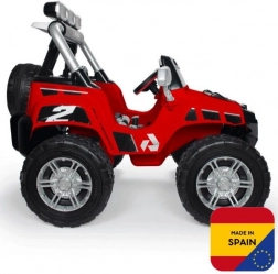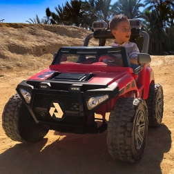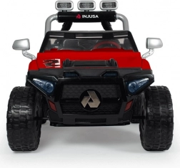 Czerwony dziecięcy elektryczny samochodzik INJUSA Monster 24V zachwyci małych kierowców od 3. roku życia. Mocna bateria 24 V (2× 12 V 7,2 Ah) zapewnia prędkość do 7 km/h, dwa siedzenia z pasami bezpieczeństwa oraz światła LED z przodu i z tyłu dodają stylu i podnoszą bezpieczeństwo jazdy. Wytrzymałe gumowe koła, 2 biegi do przodu + bieg wsteczny oraz udźwig do 50 kg czynią go idealnym wyborem do terenowych przygód.