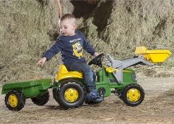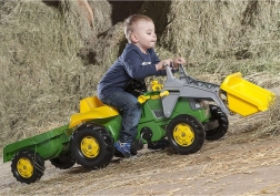Dziecięcy traktor na pedały JOHN DEERE RollyKid z podnoszoną przednią łyżką i odłączaną przyczepą zapewnia godziny aktywnej zabawy w ogrodzie i na placu zabaw. Solidna konstrukcja, wbudowany mechaniczny system dla większego bezpieczeństwa, otwierana maska ze schowkiem oraz napęd łańcuchowy dla płynnej jazdy czynią z tego traktora świetny wybór dla dzieci od 3 lat.