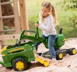 RollyDigger JOHN DEERE to wysokiej jakości dziecięca jeżdżąca koparka z funkcjonalnym ramieniem, które umożliwia nabieranie piasku, kamyczków i ziemi oraz ich łatwe przenoszenie. Dzięki obrotowemu siedzisku i podstawie 360° dzieci mogą wygodnie pracować we wszystkich kierunkach. Automatyczne blokowanie ramienia po nabraniu materiału zwiększa bezpieczeństwo i zapewnia realistyczne wrażenia z zabawy.