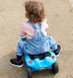 Jeździk jest wyposażony w światła LED i efekty dźwiękowe, które zapewniają autentyczne wrażenia z jazdy.