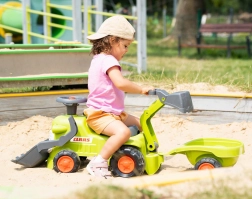 Traktor wyposażony jest w ruchomą łyżkę, co daje dzieciom radość z ładowania i przenoszenia materiału. Dzięki temu mogą poczuć się jak prawdziwi operatorzy koparek.