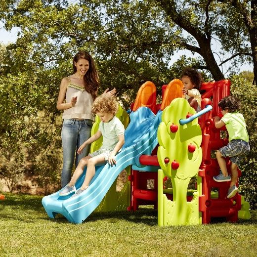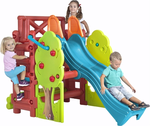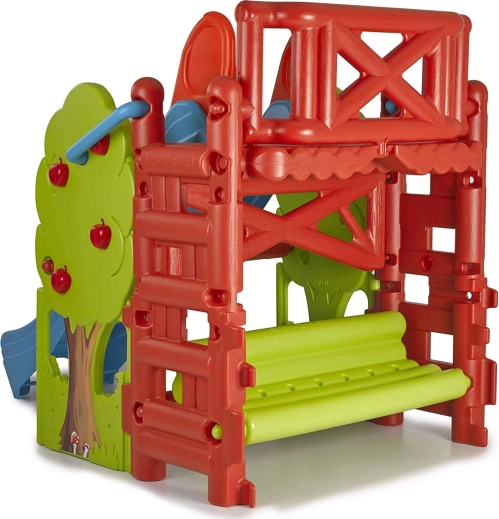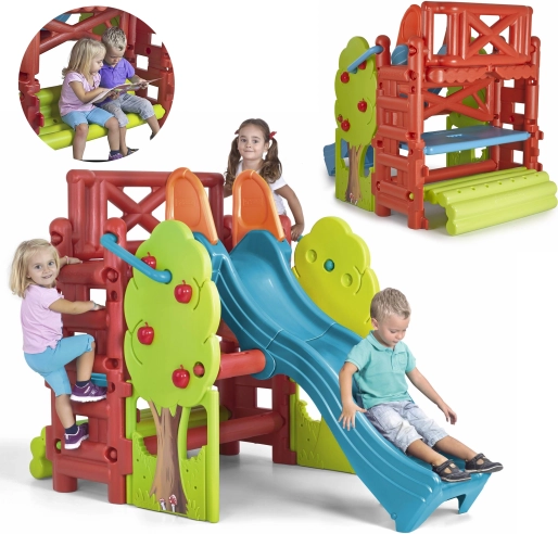Kolorowy i stabilny dziecięcy plac zabaw FEber Wood House zapewnia dzieciom mnóstwo ruchu i wyobraźni prosto w ogrodzie. Falista zjeżdżalnia 161 cm, stolik z ławeczką w 2 pozycjach oraz dwie ścianki wspinaczkowe rozwijają motorykę i wspierają aktywną zabawę. Trwała ochrona UV zapobiega blaknięciu kolorów i zapewnia długą żywotność.