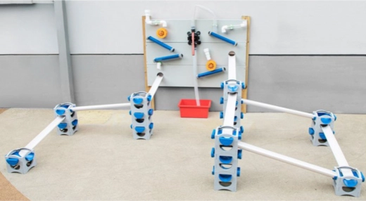 Łącz białe rurki i niebiesko‑szare klocki, tworząc własne wodne trasy – od prostych ślizgów po złożone kaskady.