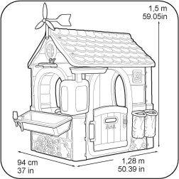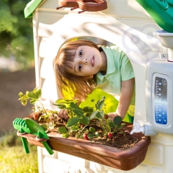 W zestawie z domkiem znajdują się narzędzia ogrodnicze, które pozwalają małym ogrodnikom sadzić nasiona i obserwować, jak rozwijają się ich rośliny.